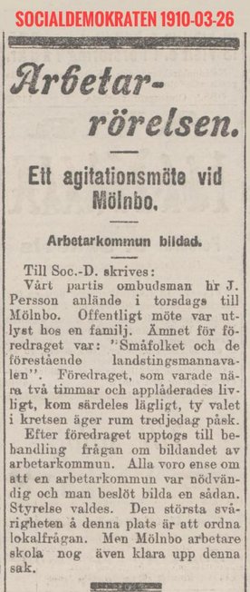Ombudsmannen J Persson (S) är på valturné i mars 1910 och besöker Mölnbo inför landstingsvalet. Mötet är offentligt men Socialdemokrater är inte välkomna i skolan och enda möjliga lokalen för ett socialistiskt valmöte är vardagsrummet hos en sympatisör. Mötet beslutar efter föredraget att bilda en arbetarekommun och samma kväll bildas en styrelse.