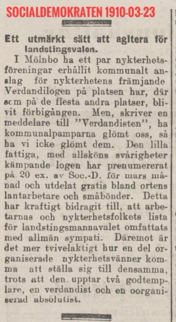 ” I Mölnbo har ett par nykterhetsföreningar erhållit kommunalt anslag för nykterhetens främjande. Verdandilogen på platsen har, därom som på de flesta andra platser, blivit förbigången.”