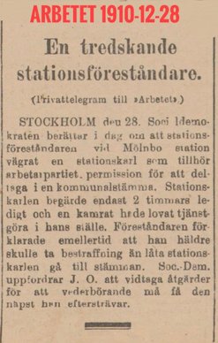 Linus Ek, anställd vid Mölnbo järnvägsstation och invald i kommunfullmäktige för (S), nekas ledighet för att delta i ett kommunalt möte. Beslutet tas av den borgerlige stations-föreståndaren Carl Sundin som hellre tog bestraffning än låta stationskarln gå på stämman.