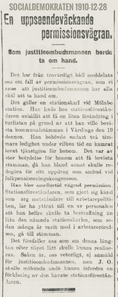 Tidningen Socialdemokraten skriver den 23 mars 1910: