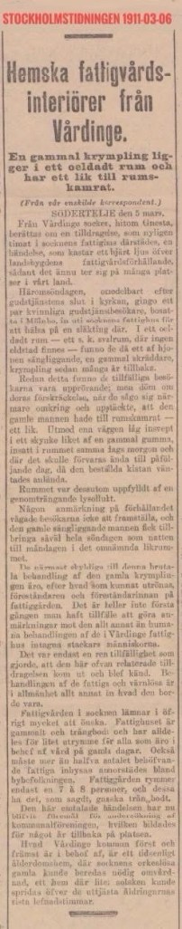 ”Hemska fattigvårdsinteriörer från Vårdinge. En gammal krympling ligger i ett oeldadt rum och har ett lik till rumskamrat.”
