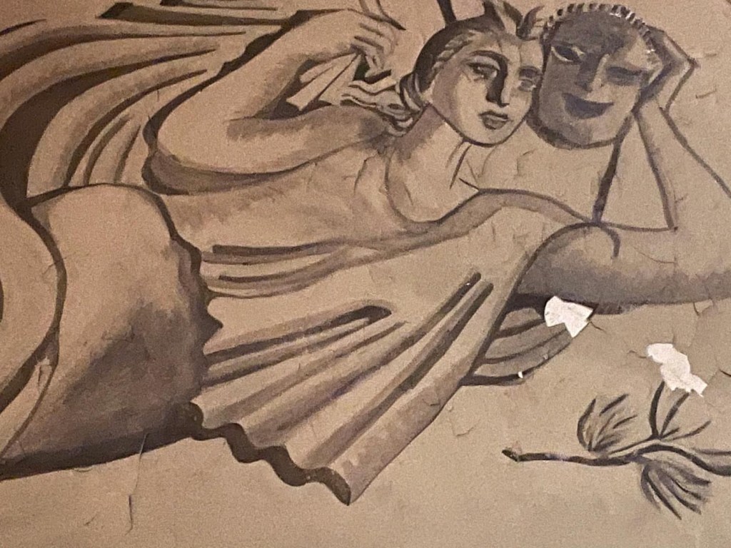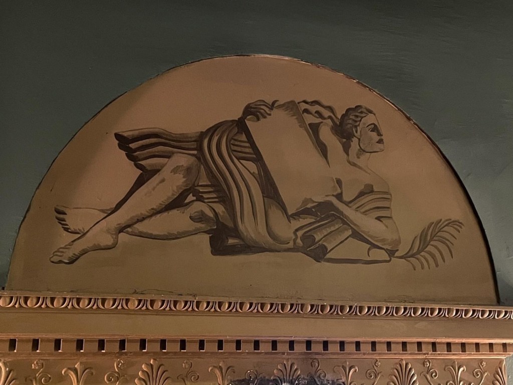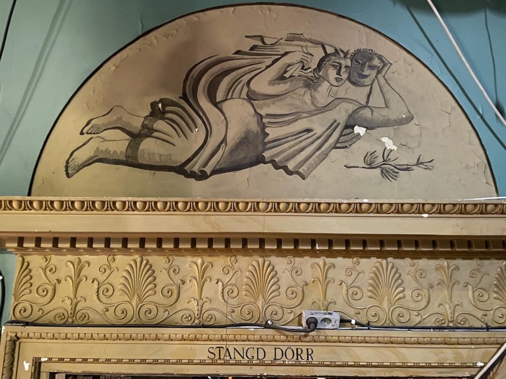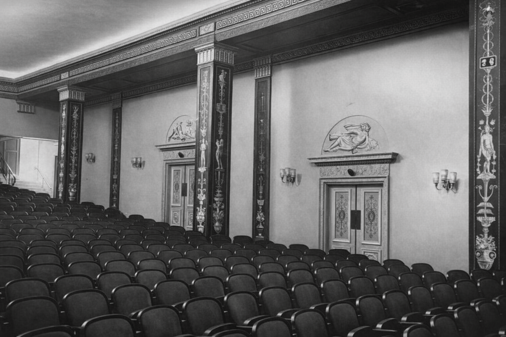 Salongen var ursprungligen inredd i en djärv nyklassicistisk stil, med vägg- och takmålningar av konstnären Gunnar Torhamn. Pelare med akantuskapitäl bar upp en marmorerad arkitrav med förgylld meanderfris. Klassicistiska dörrar pryddes av tympanonfält, reliefer och frisdekorer.