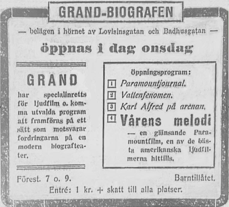 Vårens melodi (Melody in Spring) från 1934 blev starten för ljudfilm på Grand. Filmens musiknummer är skrivna av Lewis E. Gensler (musik) och Harlan Thompson (text). Filmens titelmelodi “Melody in Spring” framförd av Lanny Ross. Filmen är en romantisk ballad i 30-talsstil som kan du se på Youtube= https://youtu.be
