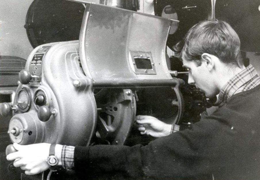 -”Regissören Göran Carmbacks pappa var en av många maskinister på Grand. På bilden står Rogers Sellberg bredvid en Ernemann 5 med kolbågs-lampa. Byttes senare till Philips FP6 och andra bågljus. I början på 1960-talet blev det ombyggt till Cinemascope, vilket är sent. Föreståndare var Harriet Stark som också satt i kassan, städade och eldade (Bion värmdes upp inför föreställningarna). Harriet bodde också i Miljonhuset. Grand ingick liksom Saga i bröderna Malmbergs Stjärnbiograferna”, skriver Roger Sellberg.