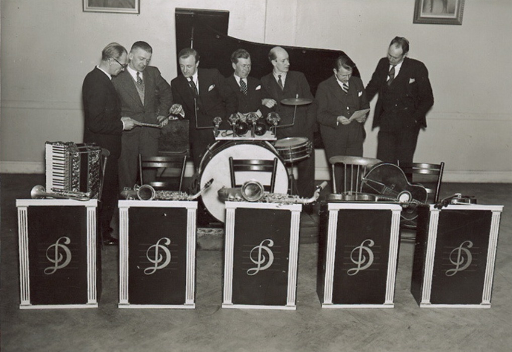 [Torekällbergets samling] David Lundahls Orkester var en av många orkestrar i Södertälje som började sin karriär på biografen. David Lundahl (1 frv). Öman (3 frv). Edvin Hultman (4 frv). Edgar Norberg (5 frv). Sam Asplund (7 frv).