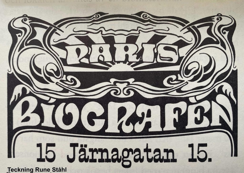 Paris-Biografens logga tecknad av Rune Ståhl i Göran Gelottes bok ”Gå på bio i Södertälje”. Loggan är som biografen, överlastad med böljande linjer och organiska former.