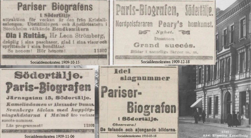 1907 tar Paris-Biografen över postens lokaler på Järnagatan 15, senare nr. ändrat till 4. Bion blir Södertäljes andra permanenta biograf. Inredningen är påkostad och salongen känns lyxig. Den 26 oktober annonserar de urpremiären i Södertälje-Södertörns Posten med sitt motto: ”Endast det bästa är gott nog!”