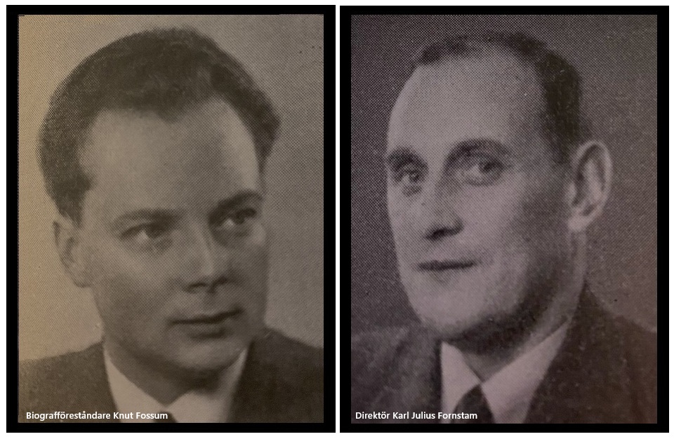 Från 30-talet är Karl Fornstam från Stockholm registrerad som ägare till Centrum-biografen. Knut Fossum är biografföreståndare och Margit Gustafsson m.fl. sålde godis innan föreställningarna började. Till höger i bild, Karl Fornstam född 5 mars 1896, började sin karriär som resande med ett biograf-tält. Till vänster, Knut Fossum föreståndare för Karls biografer i Södertälje sedan 1930. Född 7 nov. 1910 i Oslo. Knuts första jobb i branschen var konfektpojke. Bosatt på Västra Kanalgatan 7 i Södertälje.